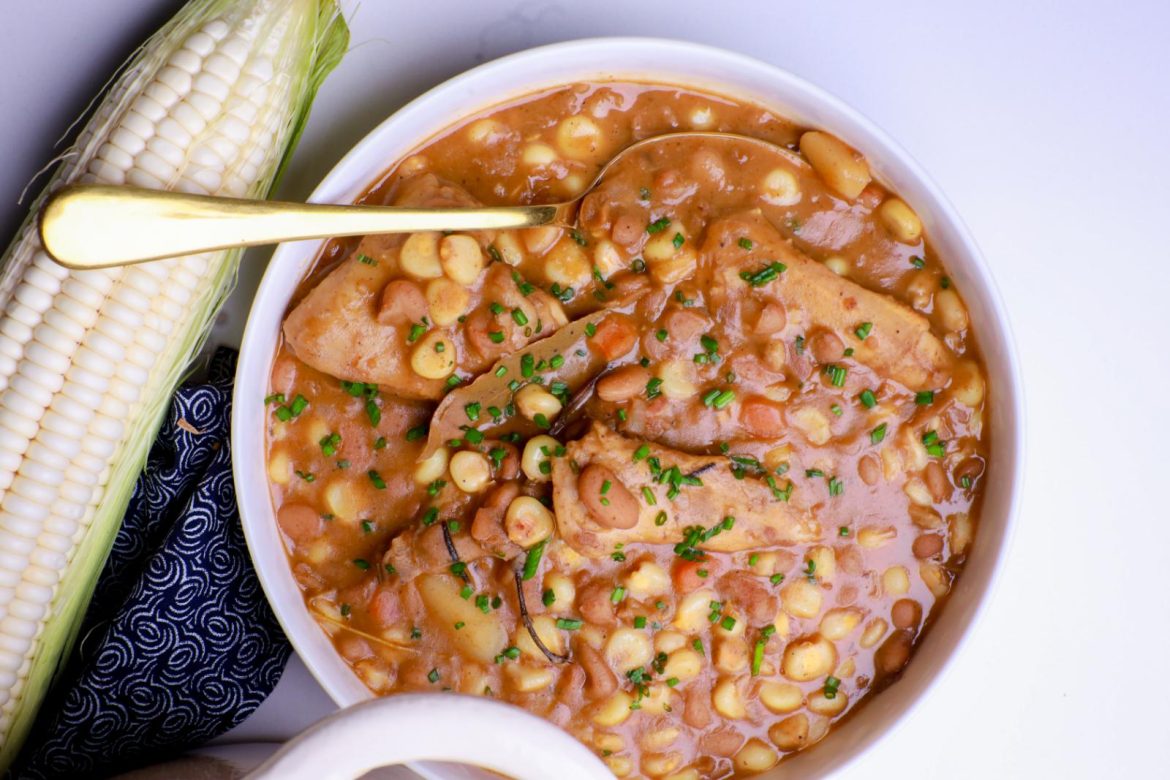 - Add beans in a deep pot, followed by 2 litres of cold water. Bring to the boil. You will will gradually add the other 2 litres of water until everything has softened. Add the mealie kernels and continue to boil for another hour.