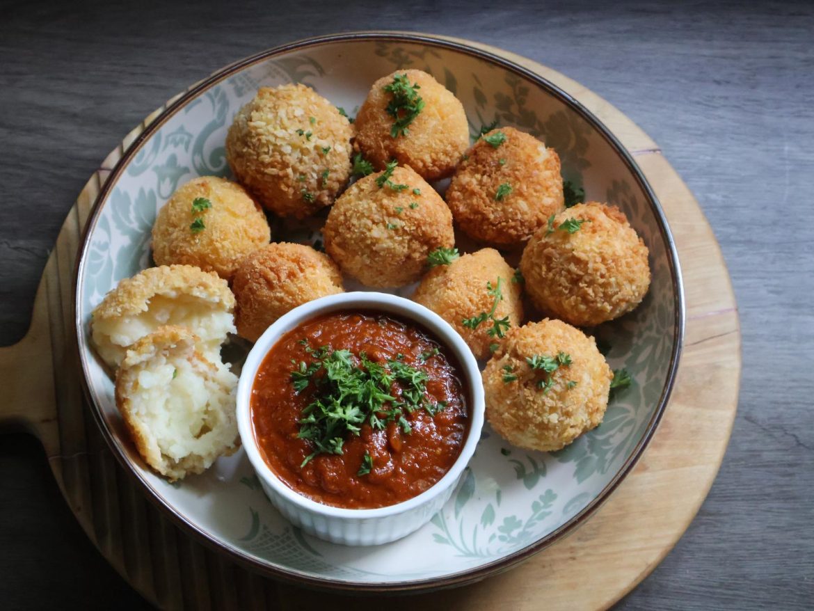 - Dip the potato balls in egg, then in crumb mixture (do this a few times until the potatoes are completely covered). This step is essential to prevent the potatoes from falling apart.