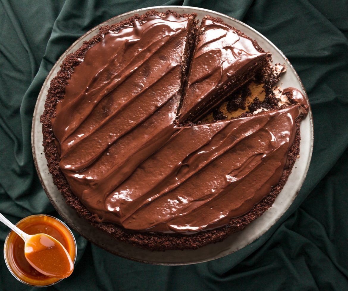 Place one cake layer on a serving plate. Spread a generous amount of chocolate buttercream onto it and create a well in the middle with an icing spatula. Warm 100g of Tannie Evita’s Classic Toffee Spread in the microwave until it is pourable. Add the toffee spread into the buttercream well. Place the second cake layer upside down (i.e. upper area flat) on top of the iced layer. Spread the remaining chocolate buttercream over the top and sides of the cake. Serve a slice of chocolate cake with a warm drizzle of Tannie Evita’s Classic Toffee Spread.