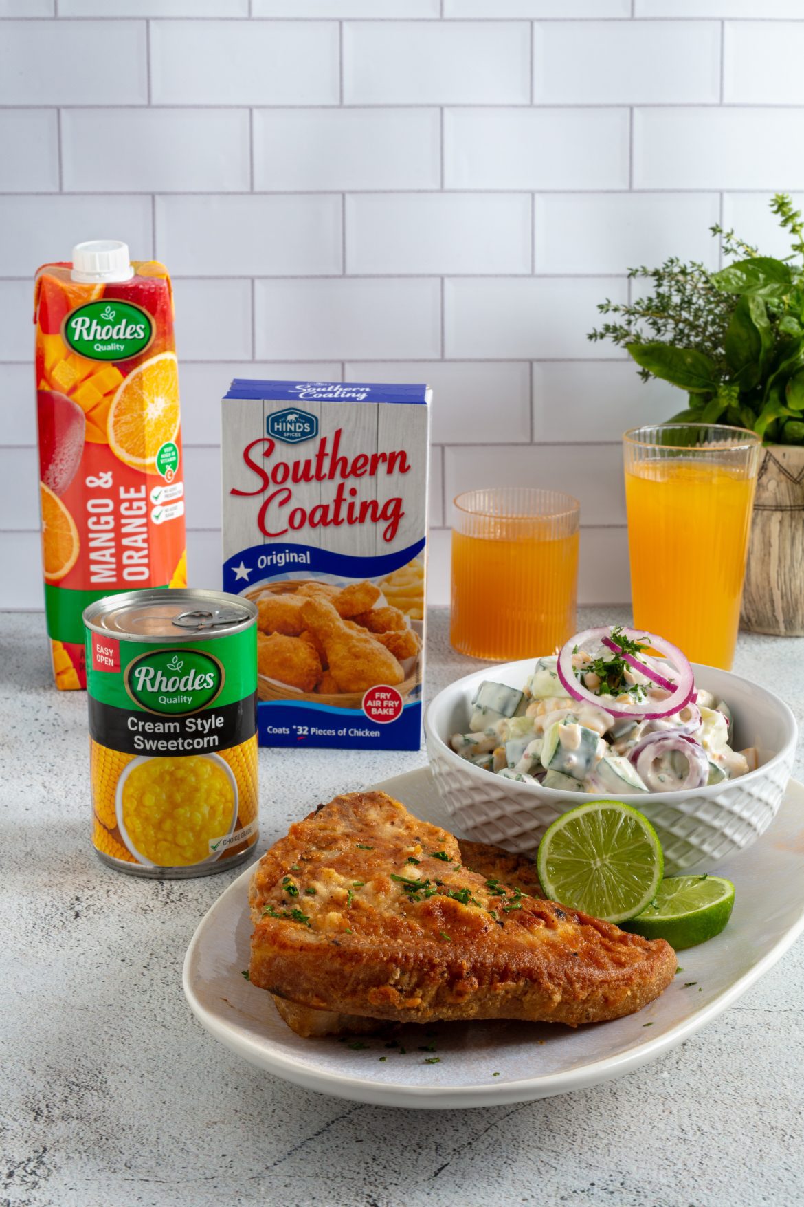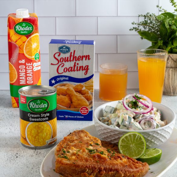 To make the salad, place the cucumber and the Rhodes Quality Whole Kernel Corn into a medium bowl. Cooking Tip - Seal the pork cutlets on each side until golden, then finish off in the air fryer or oven until cooked through Product used- Hinds Southern Coating Original