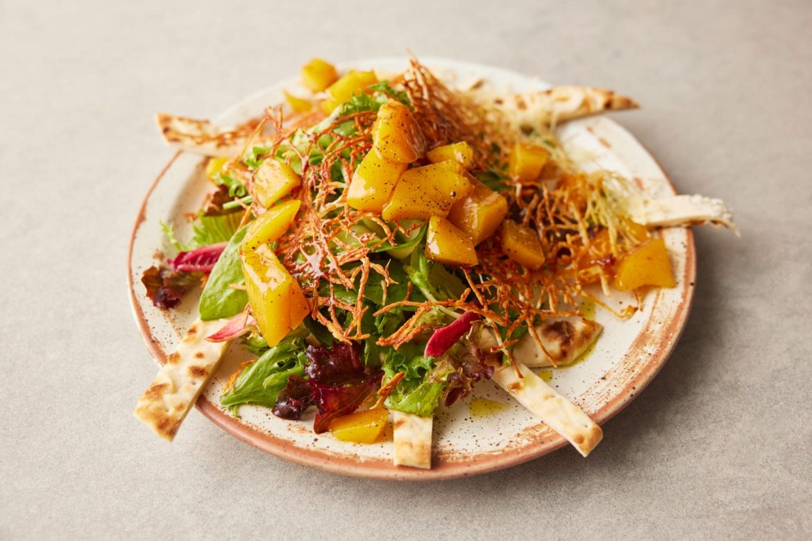 Sticky peaches, halloumi web & pickled cucumber. Whenever I’ve visited the Greek islands, I’ve been inspired by wonderful fresh and fruity halloumi salads, so I’ve had some fun here creating little webs of golden crispy halloumi that just eat so well.
