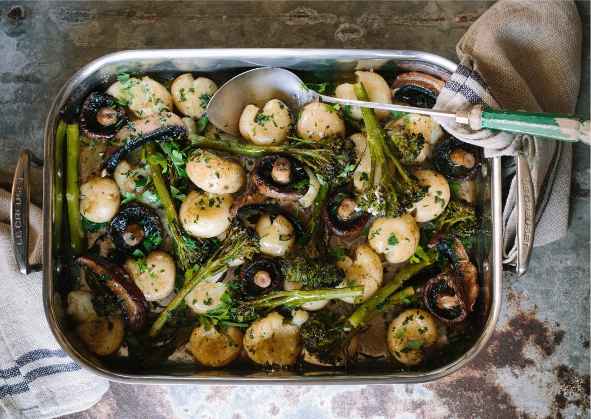 3. Arrange the potatoes in a large oven tray, then use the back of a spoon to gently crack them. Add the mushrooms & broccolini, then drizzle with the butter mixture and season with salt & pepper. Bake in a preheated oven at 220 C for 15 minutes or until the potatoes are golden brown. Scatter with parsley and serve at once.