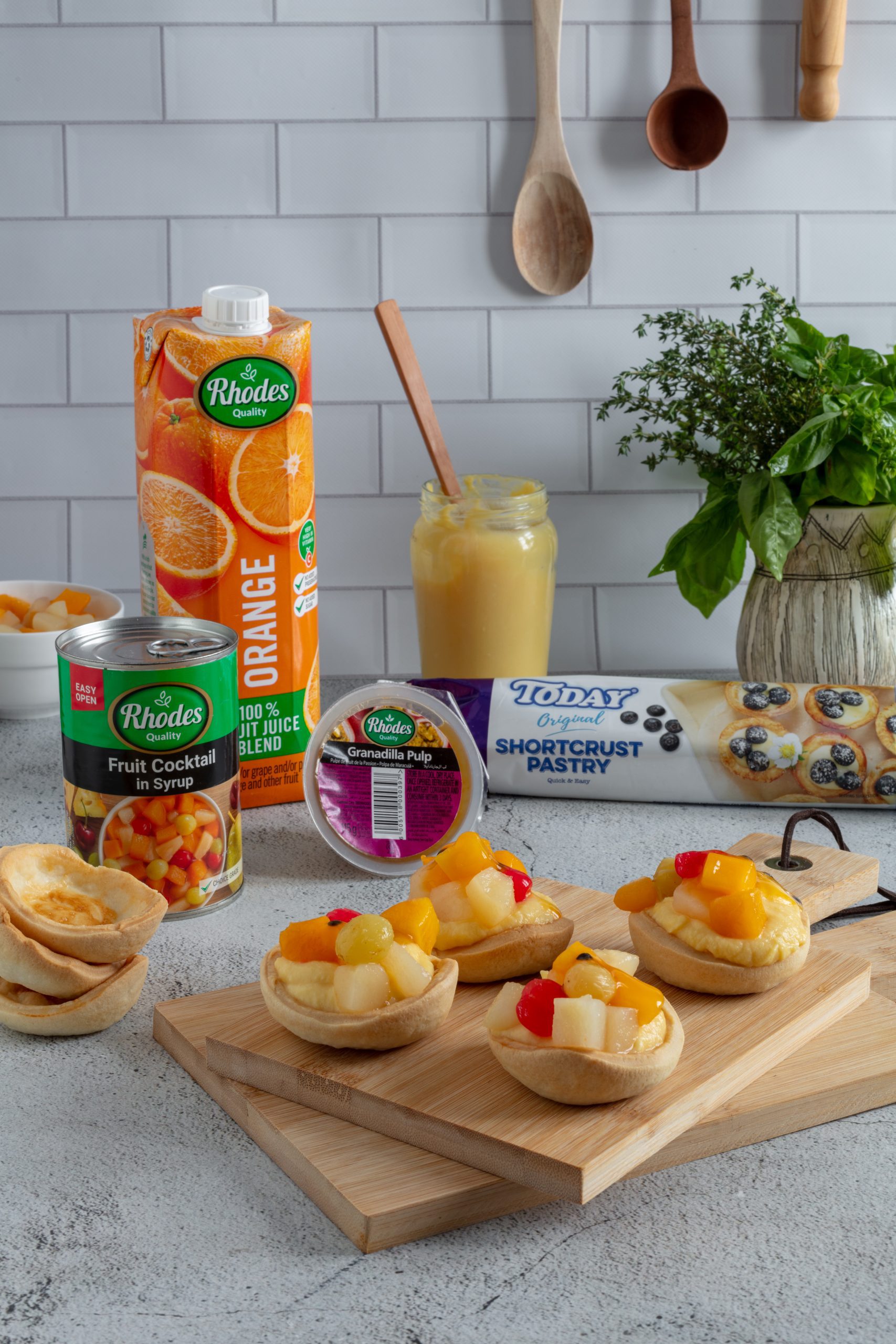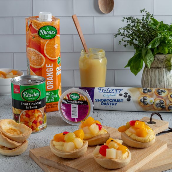 Decorate with the Rhodes Quality Fruit Cocktail and drizzle with a little Rhodes Quality Granadilla Pulp.