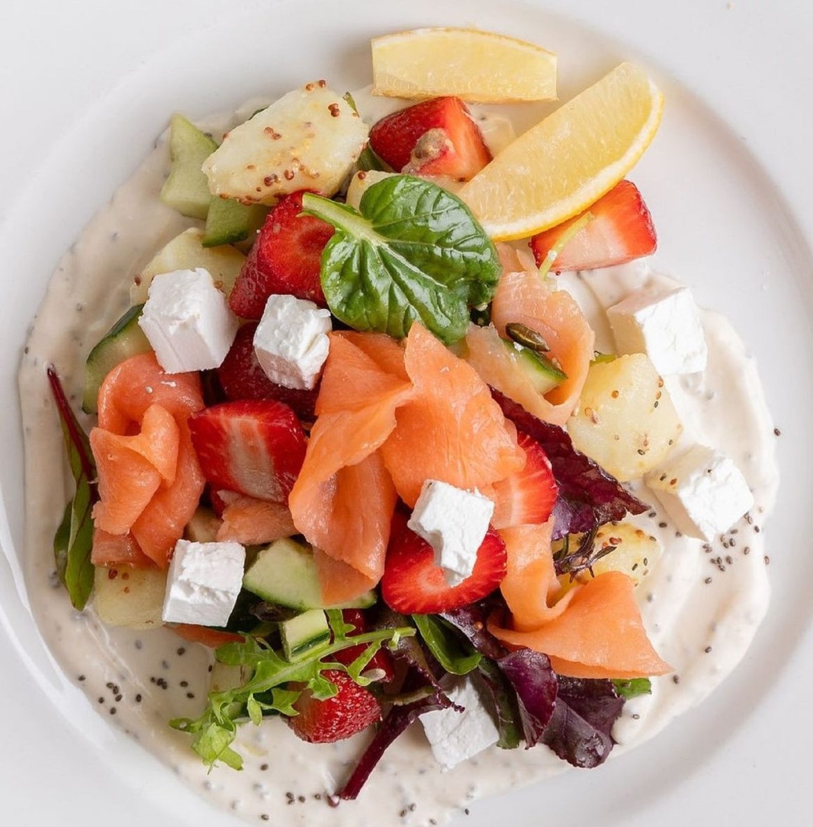Layer the Salad Gently layer baby salad leaves over the yoghurt base, then add cubed potatoes, cucumber, and strawberries. Place smoked salmon and Fairview Salada Blanc cubes on top, allowing their vibrant colours to shine.
