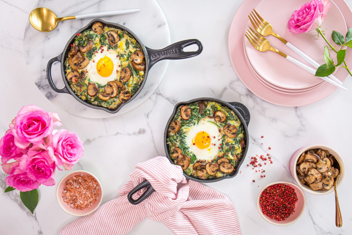 - Divide the mixture between ramekins and create a well in the centre of each one. Crack an egg into each well and bake for 10-15 minutes until the eggs are cooked to your liking. Sprinkle with some crushed pink peppercorns and serve.